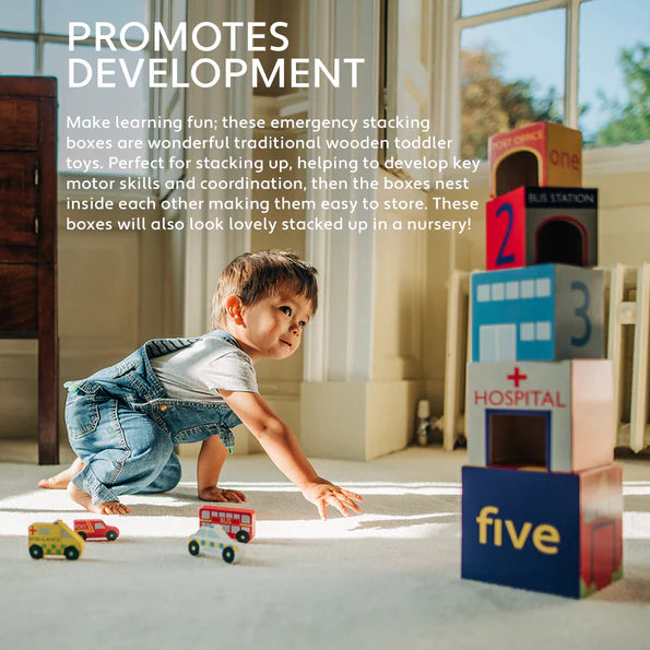 Inside each box, you'll find a matching wooden vehicle – from fire engines to ambulances – ready for imaginative rescue play. The stacking cubes help develop fine motor skills and hand-eye coordination, while the numbered design introduces early counting and number recognition.